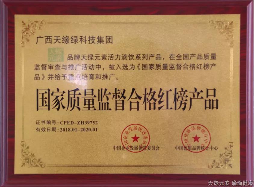 2018年1月15日天绿元素荣获国家质量监督合格红榜产品