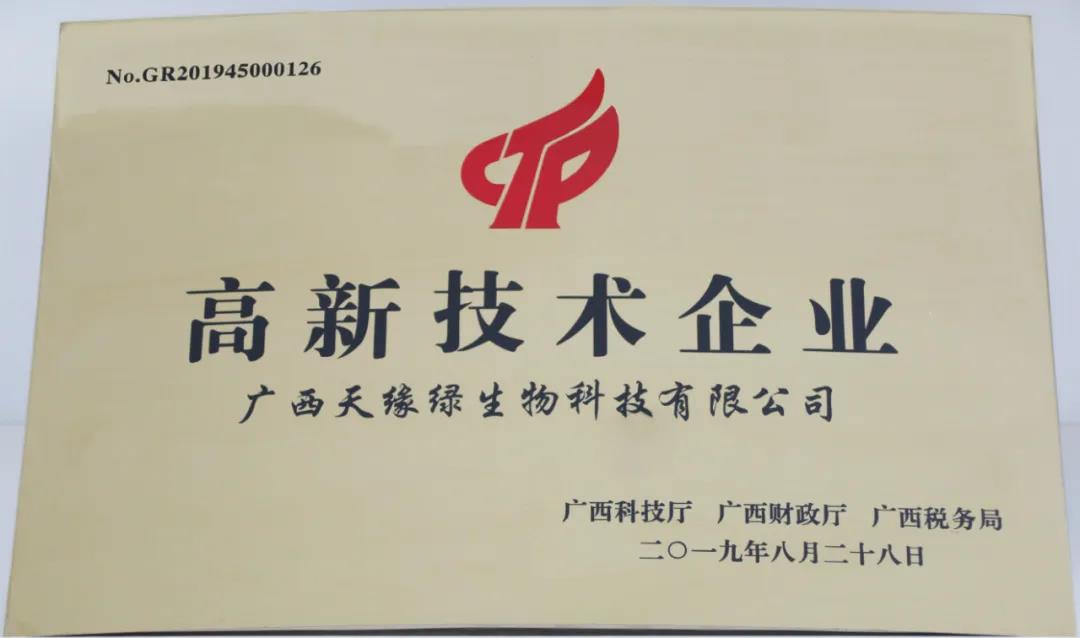 2022年10月,广西天缘绿生物科技有限公司再次通过“国家高新技术企业”认定